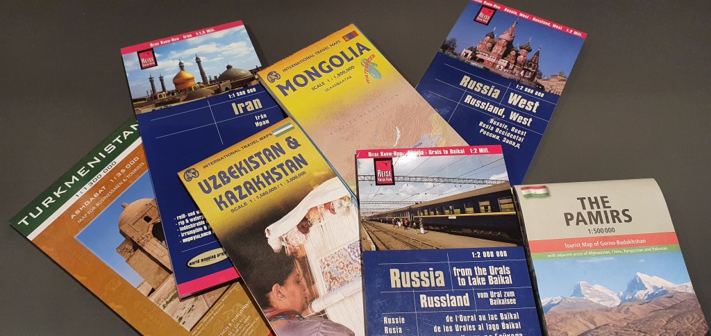Så kart bestilles. Et av kartene har de ikke inne og jeg forsøker rundt igjen før det dukker opp på Amazon. Og få dager etter dukker de opp i postkasse. Det er få gleder som er større enn å brette ut et ark på stuebordet og begynne å planlegge hvor ruten skal gå. Og sannheten begynner sakte å gå opp for meg. Det er ENORME avstander vi skal over. Kasakhstan f eks er på størrelse med Vest-Europa. Kartene er i målestokk 1:2 000 000. Og det finnes faktisk ikke vei i store områder. Så enten må vi ta en stor omvei rundt, eller ta sjansen og kjøre rett på og håpe vi finner fram og at det er framkommelig. Så her blir det å huske på en gammel fjellvettregel: Husk kart og kompass. Og ørkenens lov: Kjører du deg vill så finn strømledninger og følg de, da kommer du før eller senere til et hus. Dette kan ikke bli annet enn spennende.